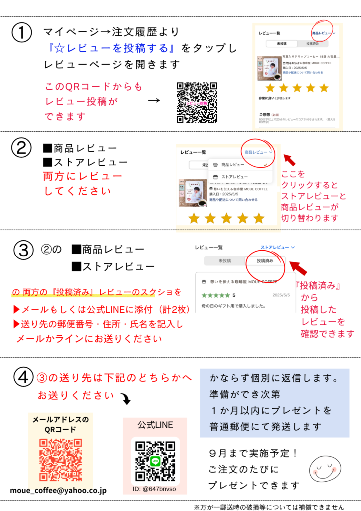 Yahoo!ショッピングレビューでプレゼント 投稿者:moue-coffee 投稿公開日:2026年4月20日 投稿カテゴリー:未分類 2026年3月から9月末まで、 Yahoo!ショッピングでお買物された方に 商品レビューとストアレビューの 両方のレビューを書いて水素水洗浄のコーヒーと無農薬のお茶を プレゼントしています(^^) まだまだ実績の少ないショップですが お客様に喜ばれる商品づくりを心がけております。 贈り物で直送のお客様には チラシを入れられないため こちらのページをご案内します。 ぜひよろしくお願いいたします(^^) おすすめ 今年の予定2025 2025年2月3日 ありがとうございました!minneハンドメイドマーケット2024 2024年12月4日 今年もありがとうございました2024 2024年12月29日